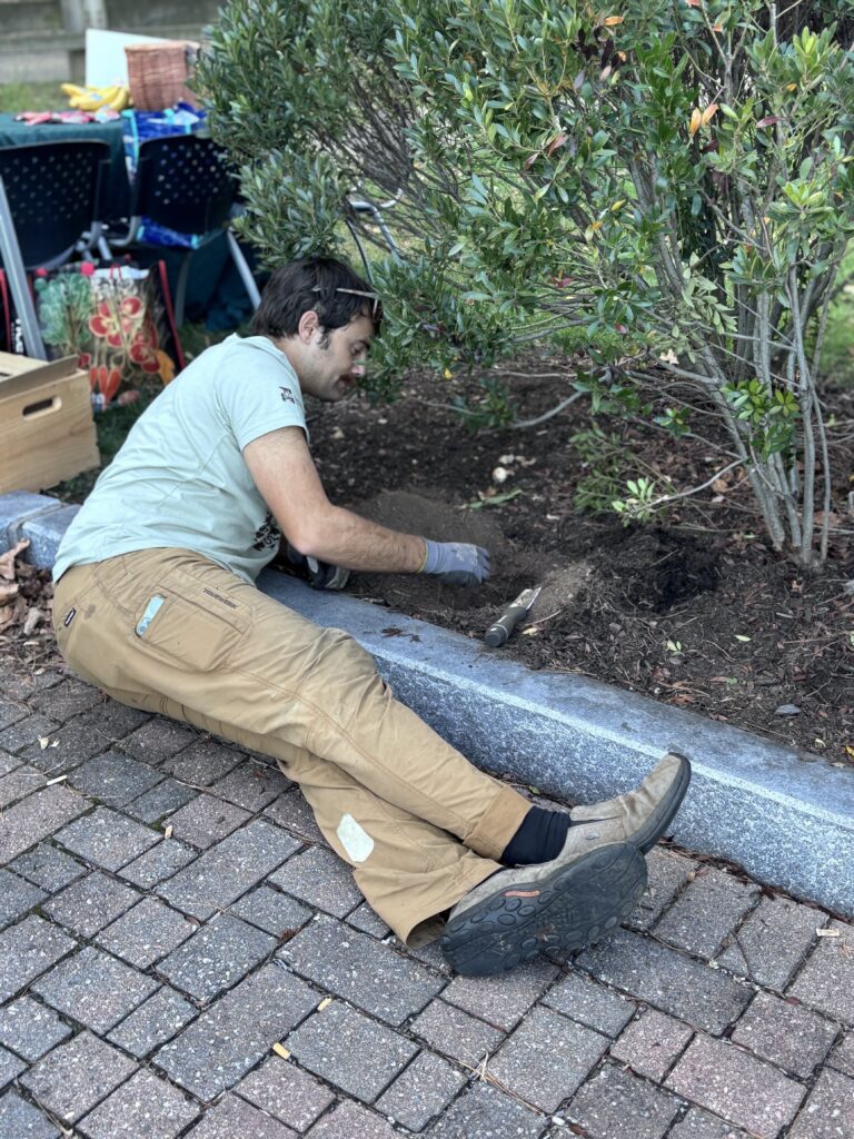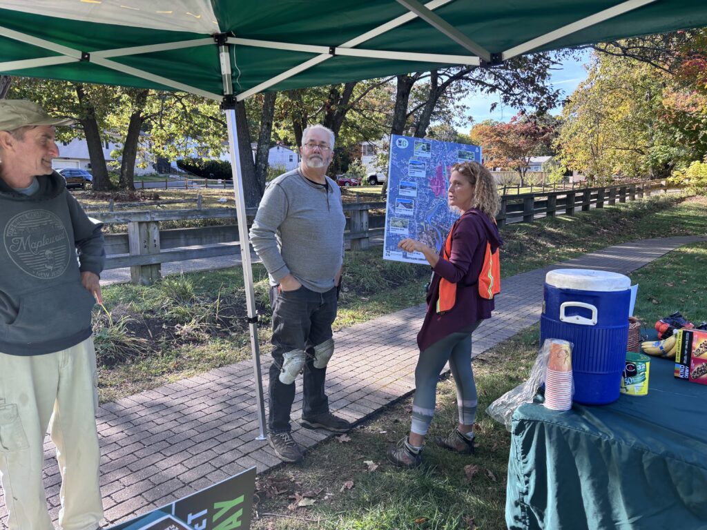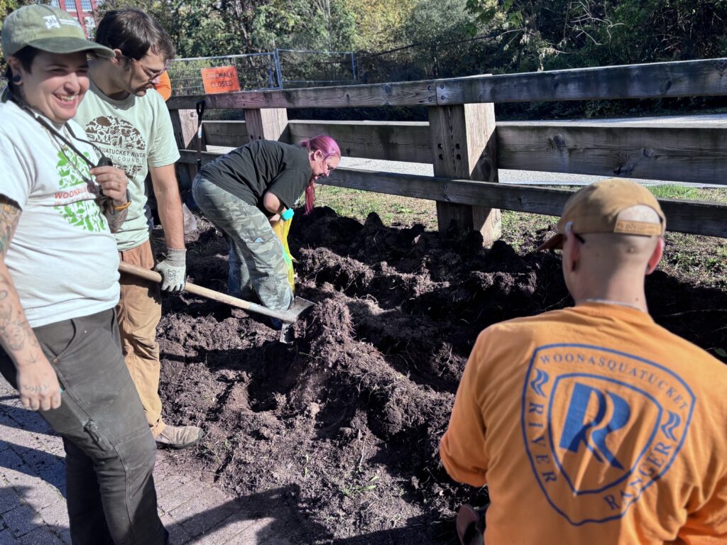 As volunteers dug in, some community members shared concerns about flooding, stream bank erosion, and potential soil safety at Cricket Field. WRWC staff explained that urban soils in Rhode Island’s riverside parks can contain low-level “urban background” contaminants from past industrial activity. While trace contaminants exist, they generally do not pose health risks when proper precautions are followed. Volunteers were encouraged to wear gloves, long pants, and closed-toe shoes, wash hands after working with soil, and supervise children closely.