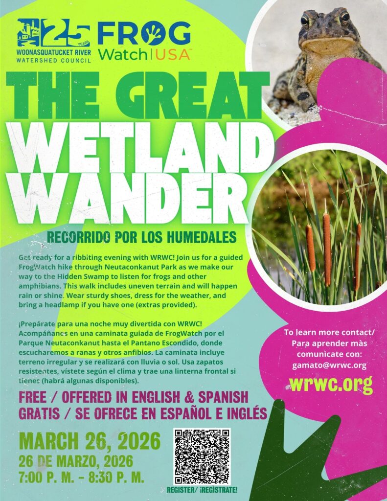 Join the Woonasquatucket River Watershed Council for an evening frog watch at Neutaconkanut Park. This guided program will lead participants on a hike over uneven terrain to reach the Hidden Swamp, where we will listen and observe local amphibians in their natural habitat.