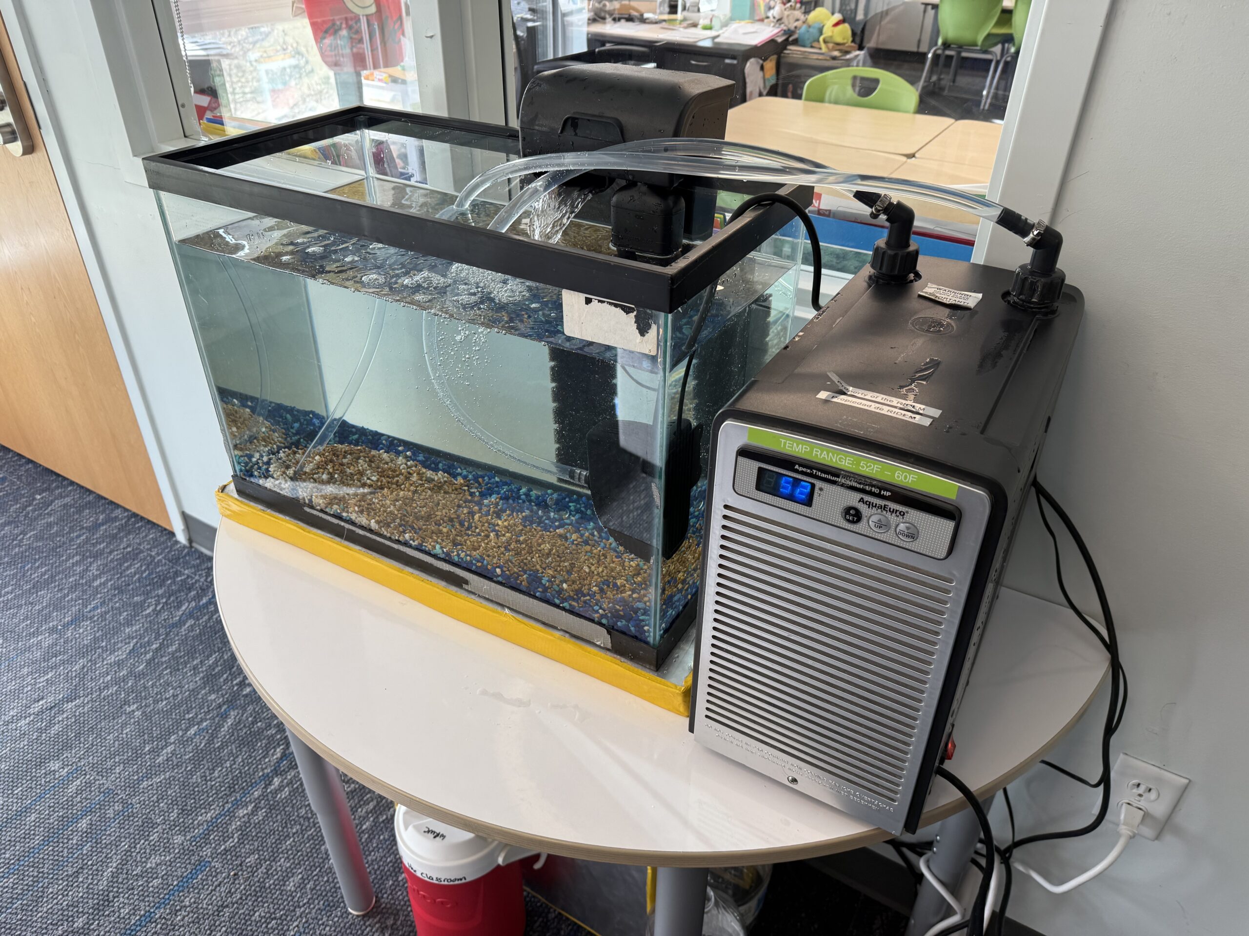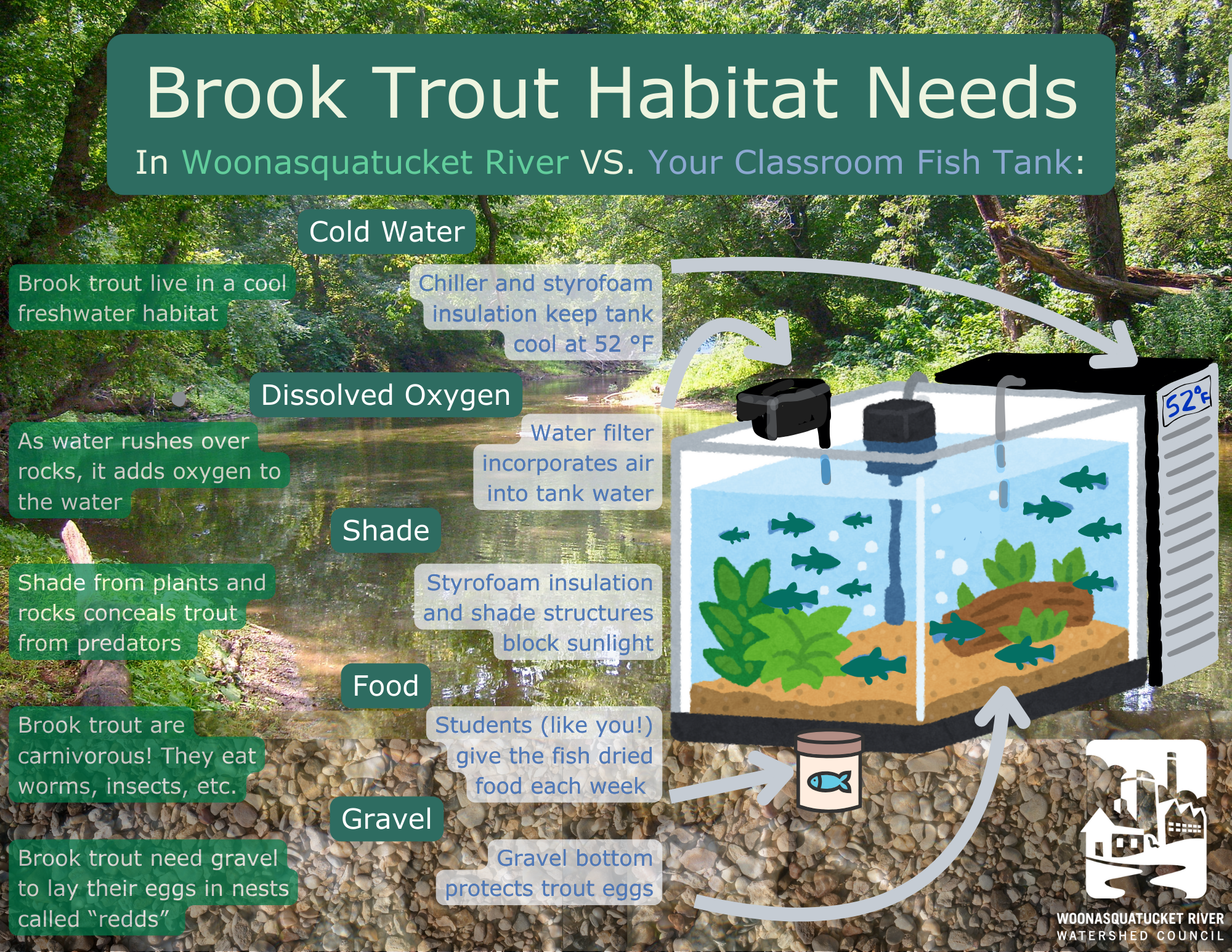 Thanks to the shiny new 20-gallon tank we installed, the students now have a cozy little home for their tiny fish. But raising brook trout isn’t just about keeping them wet—these little fish need conditions that mimic their natural environment (temperature, water quality, and flow) to grow healthy and strong. That’s why our program focuses on teaching students not just how to feed and care for the trout, but how to think like a fish biologist. Check out Figure 2 to see how we emulate their streamside habitat.