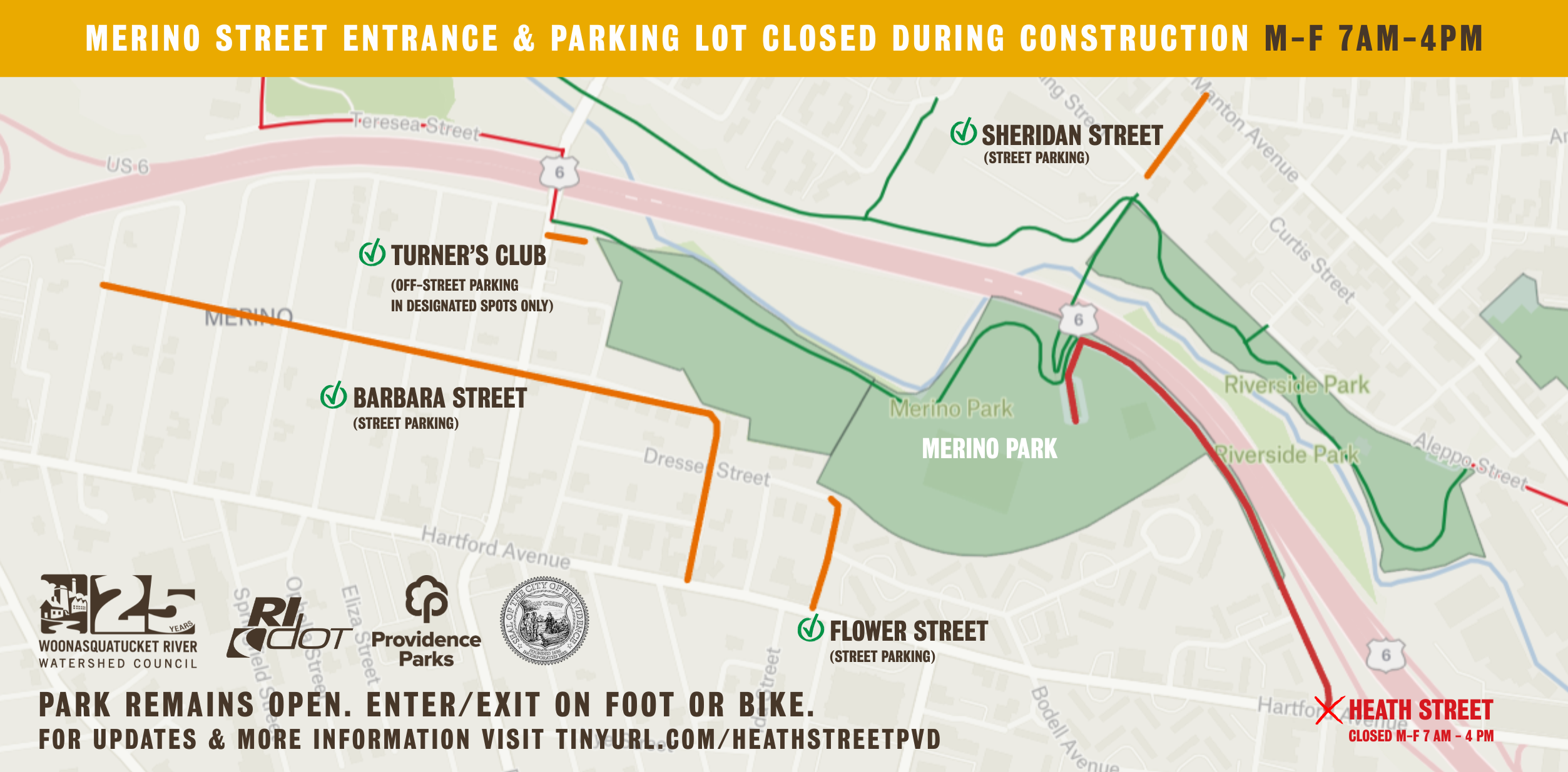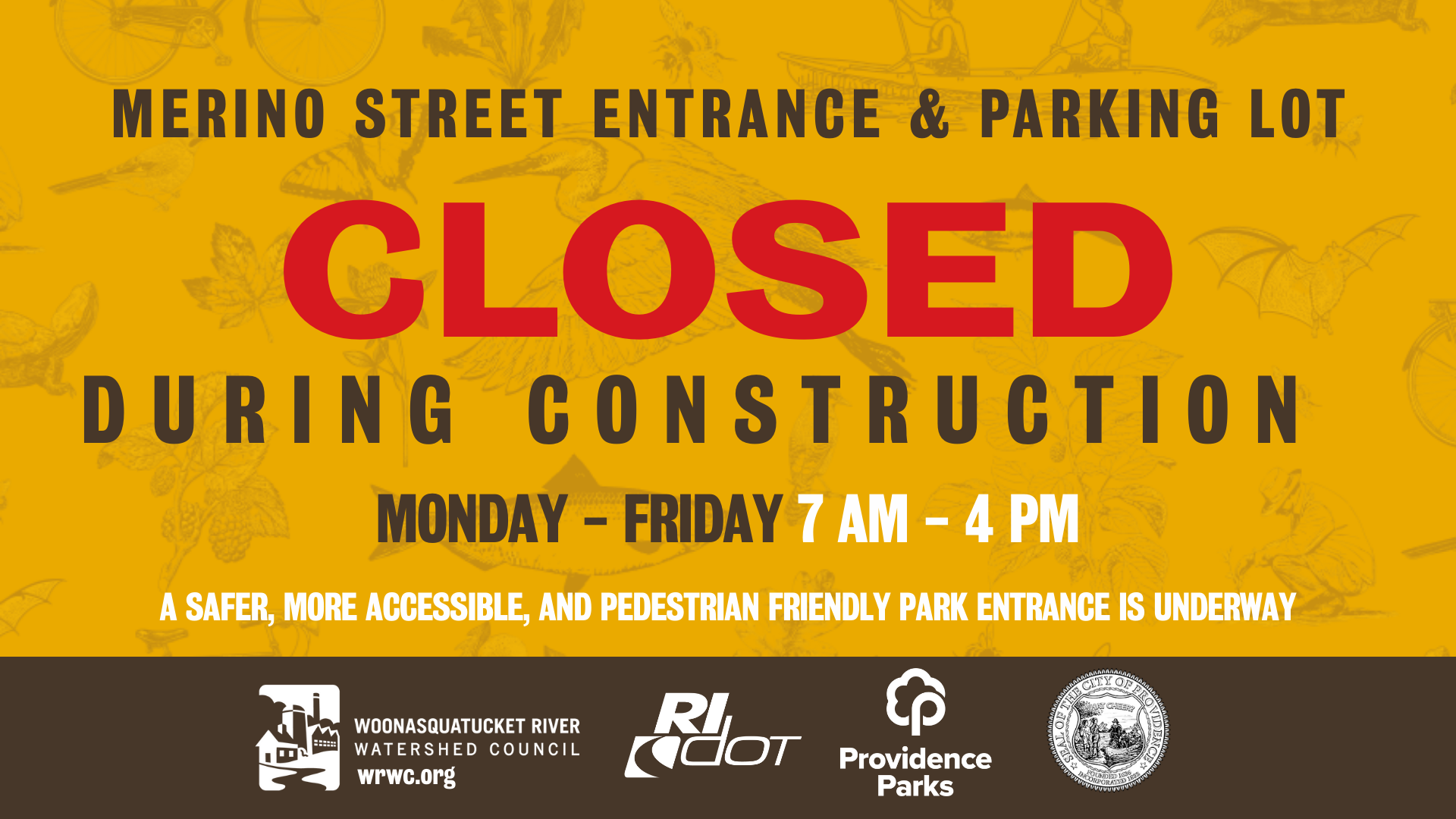 Construction of Phase 1 of the Woonasquatucket River Greenway expansion in Merino Park will begin shortly. During Phase 1, the entrance and parking lot of Merino will be closed to vehicles Monday through Friday from 7 AM to 4 PM. On-site signage will be posted to help guide visitors.